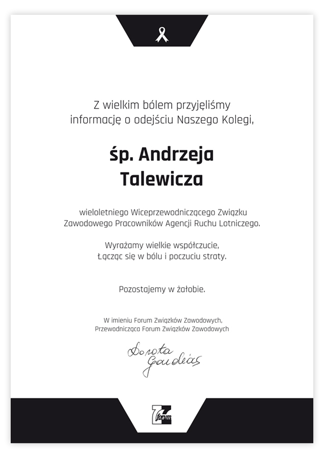 7-01-2026 Kondolencje dla Bliskich, Przyjaciół oraz Związku Zawodowego Pracowników Agencji Ruchu Lotniczego. Strona główna Aktualności Kraj Podziel się tym wpisem