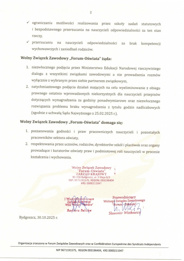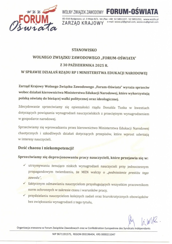 3-11-2025 Stanowisko Wolnego Związku Zawodowego ,,Forum Oświata’’ w sprawie działań rządu RP i Ministerstwa Edukacji Narodowej Strona główna Aktualności Kraj Podziel się tym wpisem